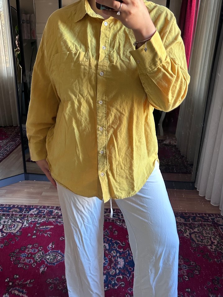 Sarı keten, düğmeli, uzun kollu, yakalı, bol kesim kadın gömlek. Günlük kullanıma uygun rahat bir sokak stili ürünü.