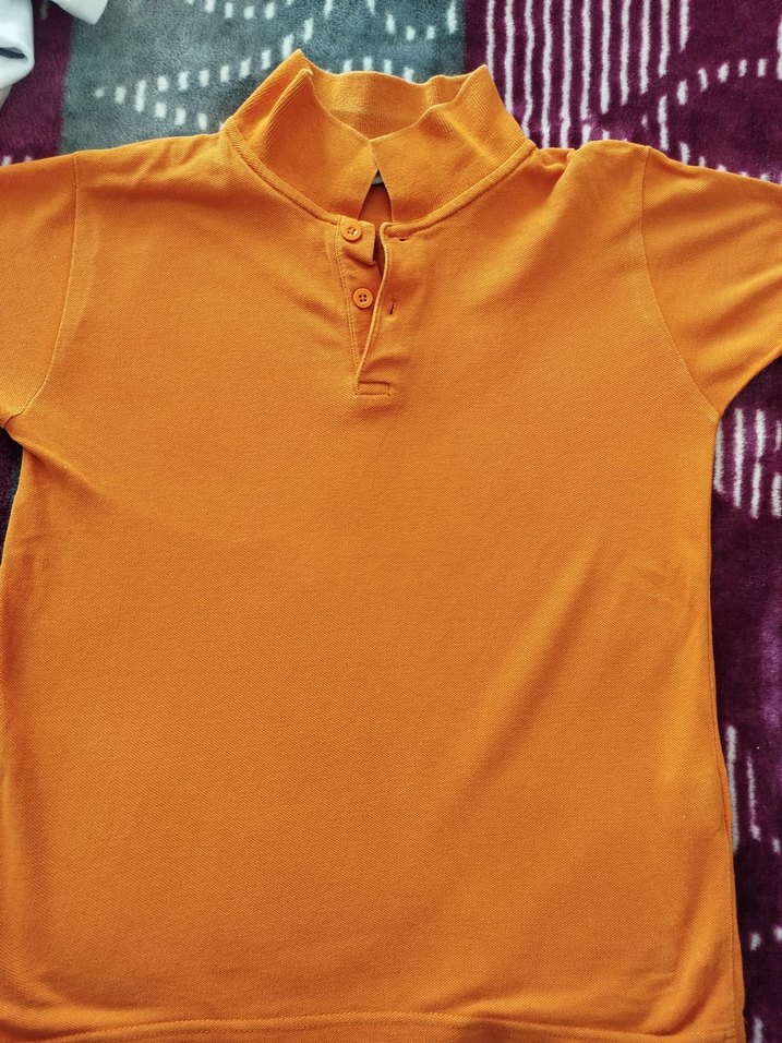 turuncu renkli, düğmeli yakalı ve kısa kollu erkek çocuk polo tişört. Regular kesim ve sentetik kumaştan üretilmiştir, günlük sokak stiline uygundur.