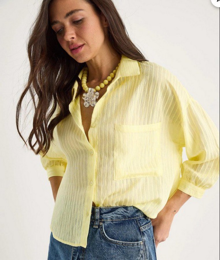 Hafif sarı renkte, düğmeli, kısa kollu, keten kumaştan rahat kesim kadın gömleği. Salaş kesimi ve bağlama deseniyle gündelik stil için uygun. zara değildir
