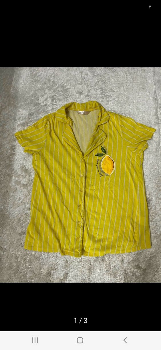 Sarı, düğmeli, kısa kollu, yakalı kadın gömleği. Rahat kesim ve baskılı limon deseniyle günlük sokak stiline uygun. pijama ustu