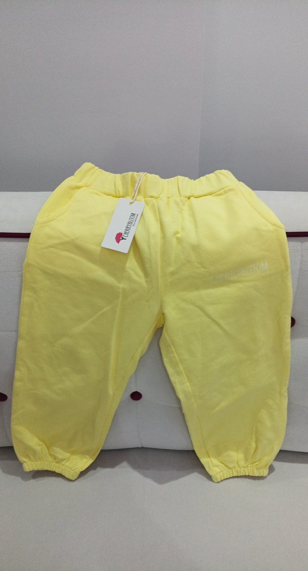 Sarı renkli, düğmeli ve bol kesim kız çocuk pantolonu. Yumuşak ve sıcak kumaştan, elastik paçalarla rahat kullanım sağlar.