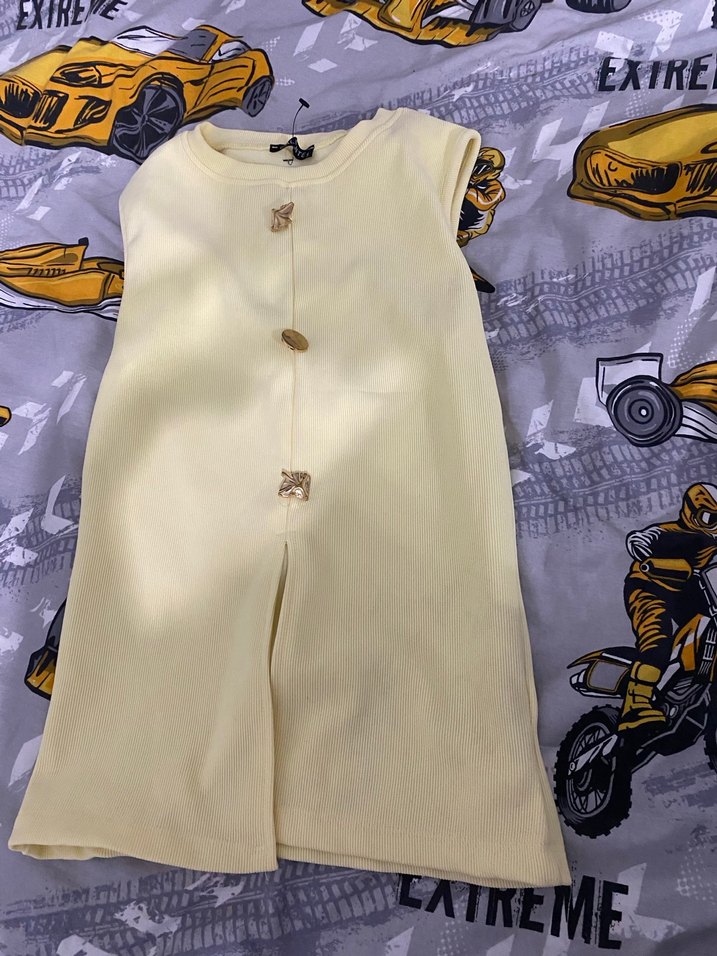 Düğmeli ve straplez yakalı, sarı renk kız çocuk yeleği, sentetik kumaştan, dar kesim ve kolsuz tasarıma sahiptir.