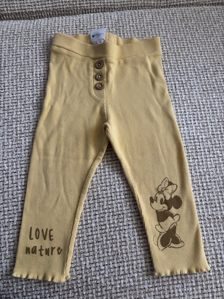 Pamuklu, sarı renk kız çocuk taytı, düğme detaylı ve 'LOVE nature' yazılı baskılı Minnie Mouse figürlü, rahat kesim.