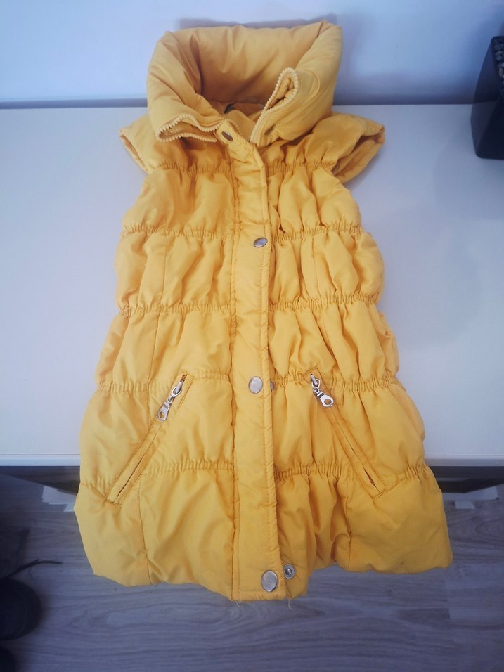 Sarı, düğmeli, kolsuz, straplez yakalı, normal midi boyda, yumuşak ve sıcak kumaştan yapılmış, rahat kesimli kadın yelek. Sokak stiline uygun, parlak ve desensiz, günlük kullanıma uygun.