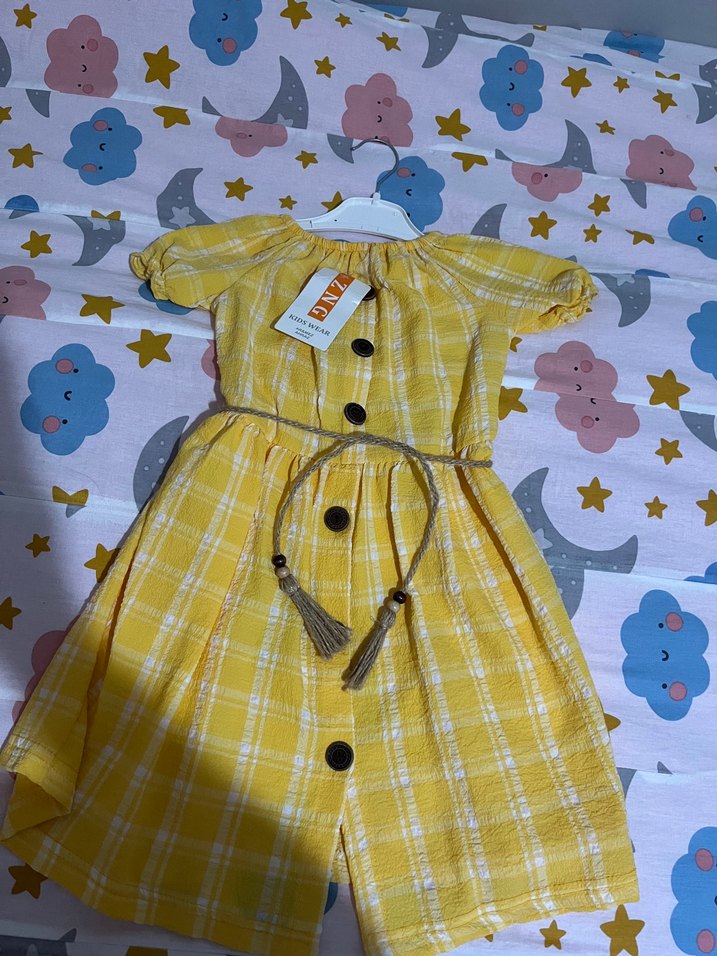 Sarı pamuklu, düğmeli ve bol kesim kız elbisesi. Kısa kabarık kollu ve bel bağlamalıdır. Rahat ve günlük kullanım için uygundur. Ürün etiketli sıfırdır 3 4 yaş için uygundur