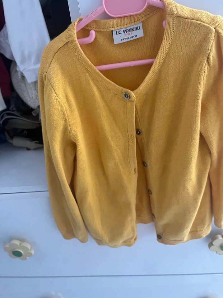 Sarı, düğmeli, uzun kollu, bol kesim kız hırkası. Yumuşak ve rahat örme kumaştan, düz pastel tonlarda.