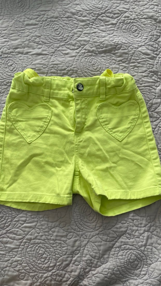 Düğmeli, kalıplı sarı kız şortu, kalp şeklinde ceplere sahip, yumuşak sentetik kumaştan. Rahat sokak stili için uygun.