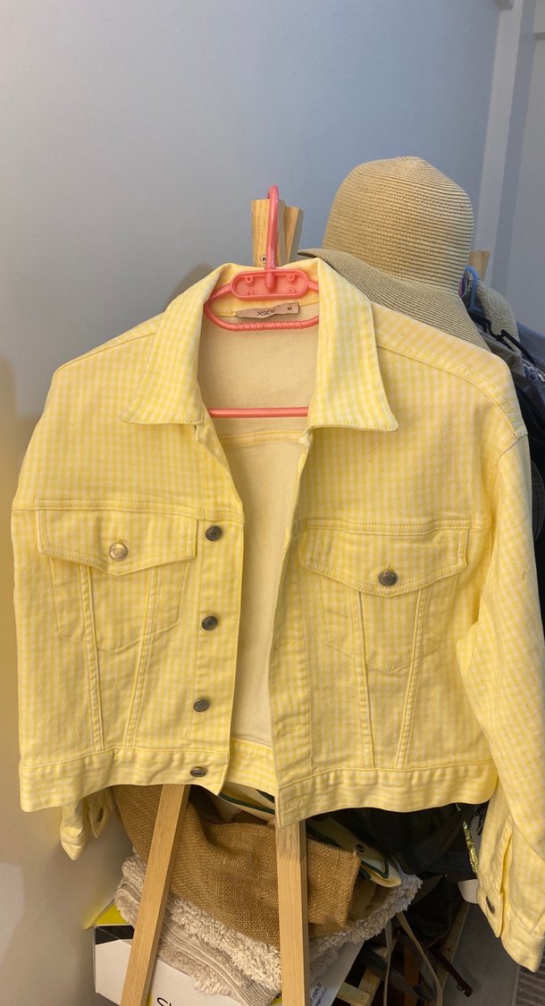 Sarı pastel renkte, düğmeli ve notched yaka detaylı midi denim ceket. Regular kesim, askılı kollu ve günlük kullanıma uygun tie-dye desenli.