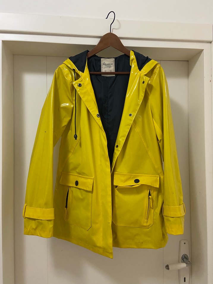 Parlak sarı renkte, düğmeli ve notalı yaka tasarımlı, bol kesim midi uzunlukta kadın yağmurluğu. Sentetik kumaştan, uzun kollu ve dış mekan kullanımı için uygun. Birkaç yerinde leke ve koltuk altında dikiş sökülmesi vardır. M beden.
