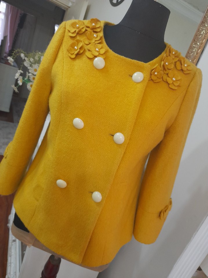 Sarı yün ceket, düğmeli ve yakasında işlemeli çiçek detaylarıyla klasik kesimdedir. Uzun kollu, normal boy ve ofis kullanımı için uygundur. #ceket #kaşeceket #kışlıkceket kışlık kaliteli kaşe kumaş astarlı (Gögüs Çift düğmeli içte 13 cm pay var düğmelerle isteğe göre daraltılabilir genişletilebilir (Gögüs 48 boy 58 kol boyu omuzdan 48 arka sırt 38 yeni butikten kalma şık kaliteli üründür beden aralığı var ölçülere bakıp alın lütfen