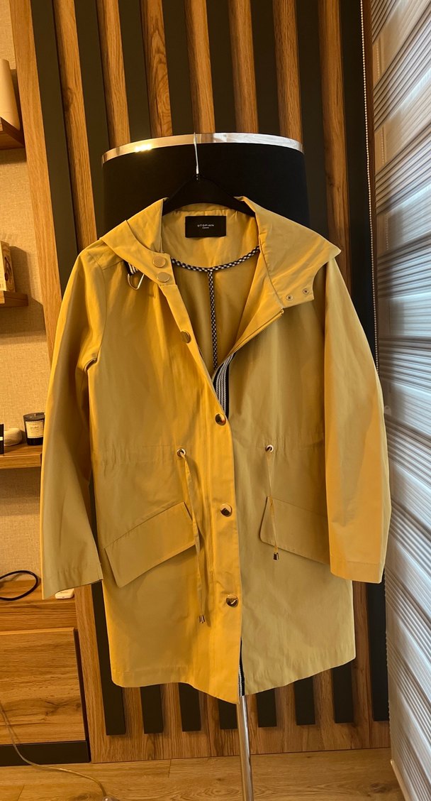 Sarı midi yağmurluk, düğmeli ve kesik yakalıdır. Uzun kollu, parlak sentetik kumaştan, günlük rahat kullanıma uygundur. ️
