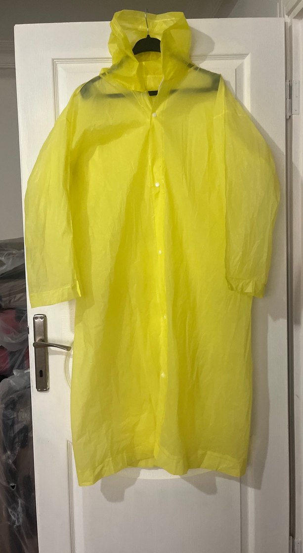 Sarı, parlak plastikten yapılmış, düğmeli, kısa kollu ve yakalı midi uzunlukta bol kesim yağmurluktur. ️l xl beden olur
