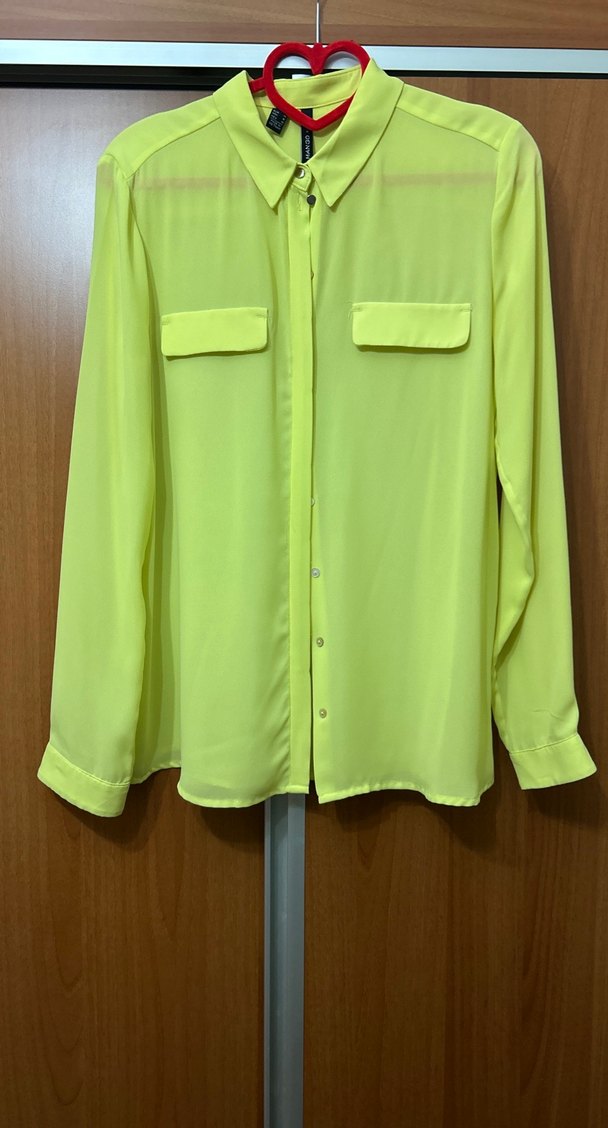 Düğmeli, uzun kollu, yakalı, bol kesim sarı gömlek. Parlak sentetik kumaştan, ofis kullanımı için uygun.