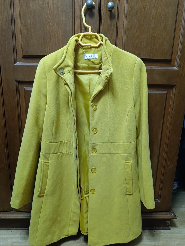 Sarı uzun kaban, düğmeli kapama ve yan ceplere sahiptir. Yumuşak ve sıcak kumaştan üretilmiştir.
