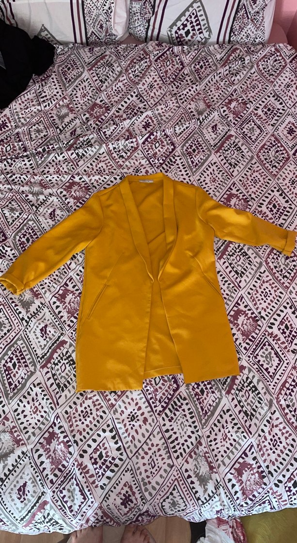 Sarı uzun kadın ceketi, düğmeli ve notched yaka detaylıdır. Gevşek kesimi ve uzun kolludur, sentetik kumaştan üretilmiştir. Sokak stiline uygun, retro ve rahat bir görünüm sunar.