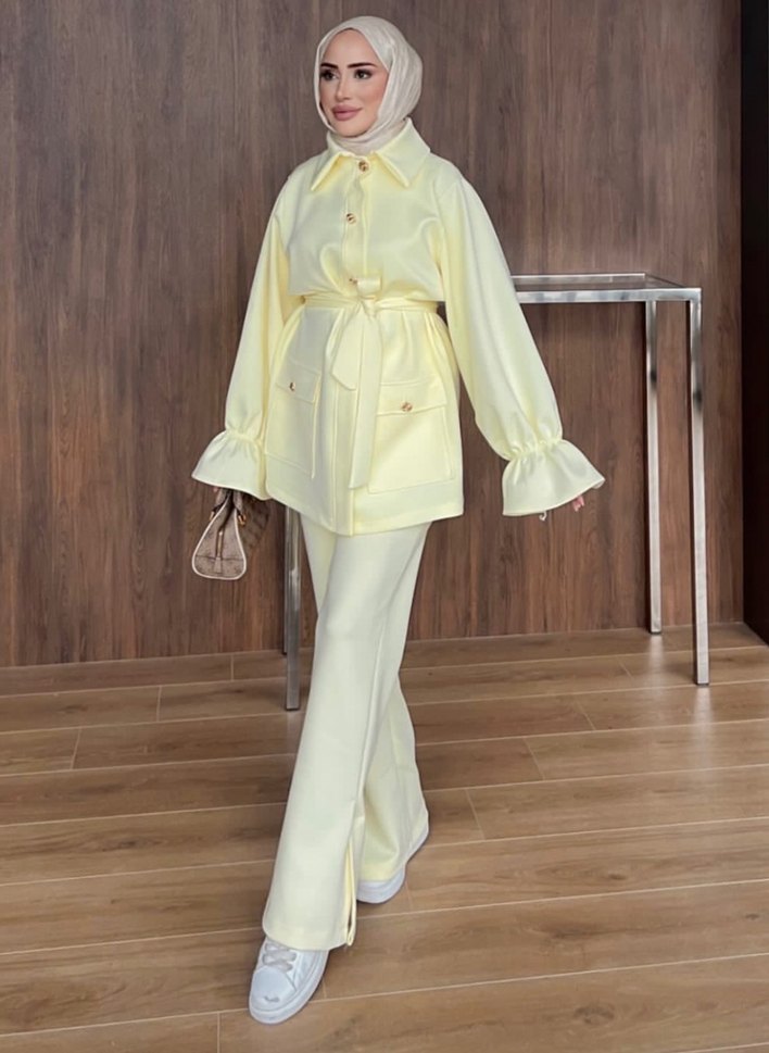 Sarı uzun kadın takımı, yakalı ve düğmeli detaylıdır. Yumuşak sentetik kumaştan, bağcıklı ve batik desenlidir. Ofis kullanımı için minimalist ve trend casual tarzda. ✨