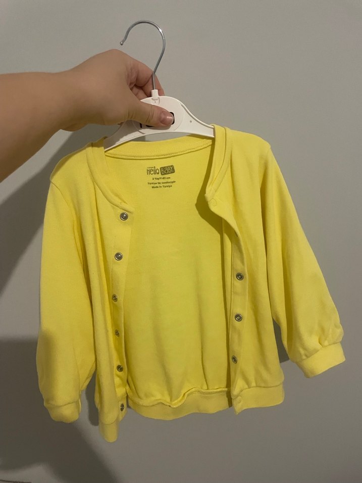Yumuşak ve sıcak kumaştan, düğmeli, uzun kollu, bol kesim sarı renkte hırka Pastel tonlarda, sade tasarım.