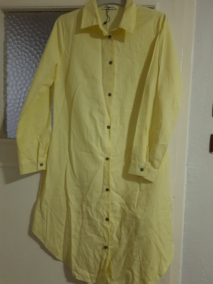 Açık sarı, midi boy, keten kumaştan, düğmeli ve yakalı gömlek. Uzun kollu ve bol kesim, günlük rahat kullanım için uygundur.