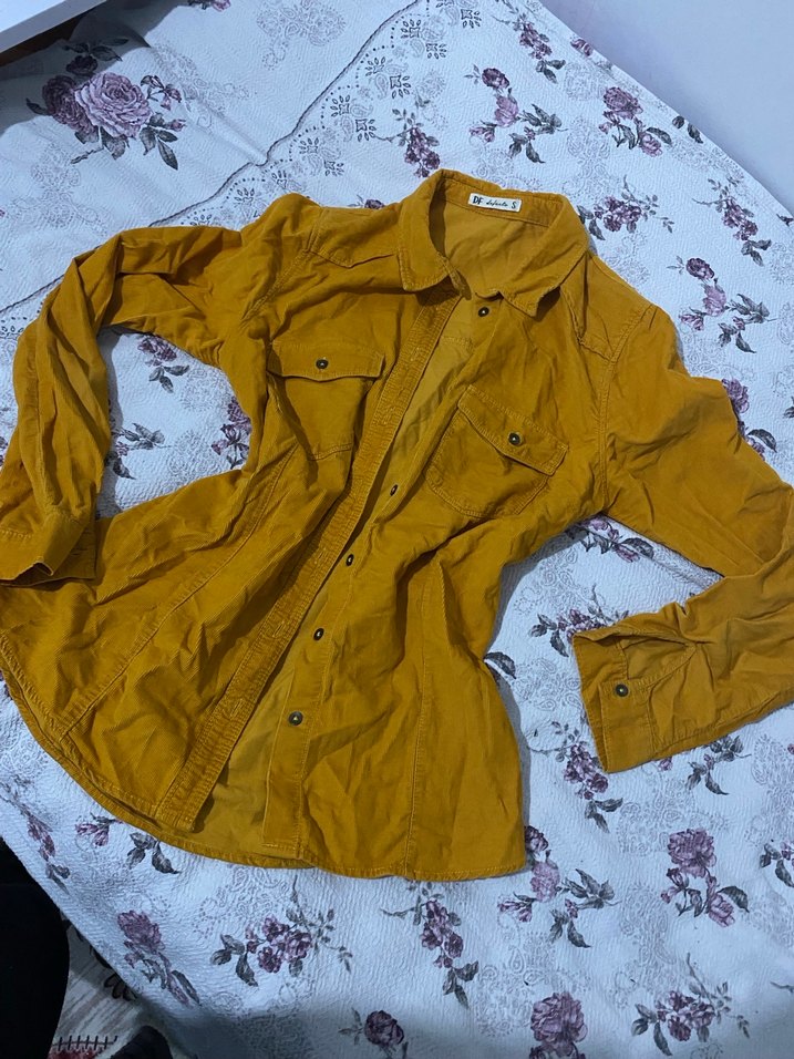 Sarı Düğmeli Uzun Kollu Keten Gömlek