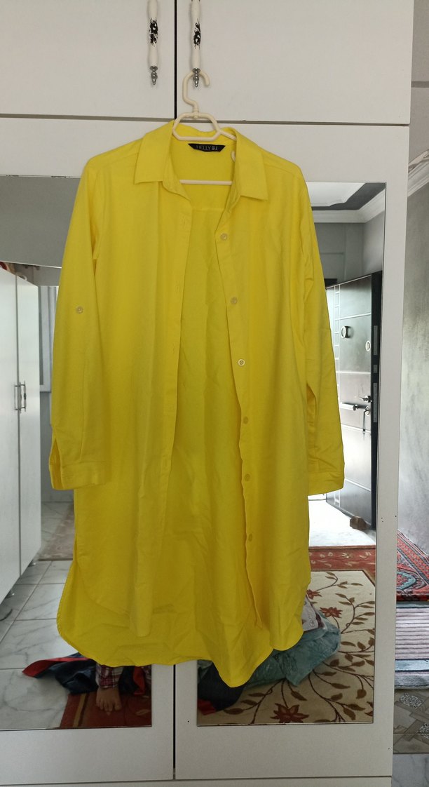 Sarı, keten kumaştan, uzun kollu ve düğmeli, notched lapel yakalı bol kesim gömlek. Parlak görünümlü, günlük kullanım için uygun.