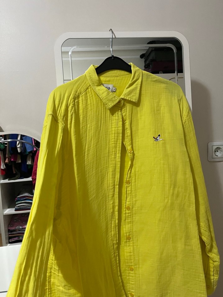 Sarı renkte, keten kumaştan üretilmiş, düğmeli ve uzun kollu, yakalı, bol kesim gömlek. Parlak dokusu günlük sokak tarzına uygundur.