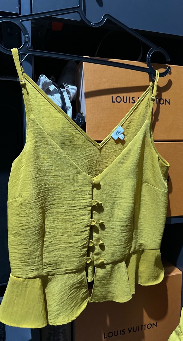 Sarı renkli, düğmeli ön detaylı ve V yakalı, sentetik yumuşak kumaştan, kısa ve salaş kesim kadın atlet. Günlük sokak stiline uygundur.