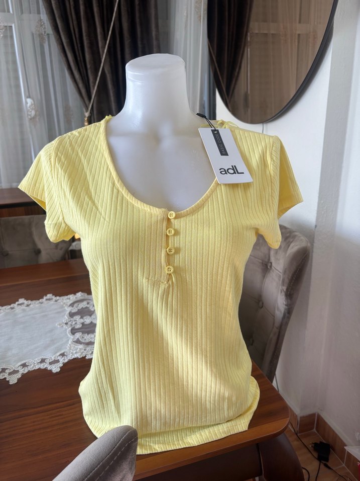 Sarı Düğmeli V Yaka Kısa Kollu Tişört