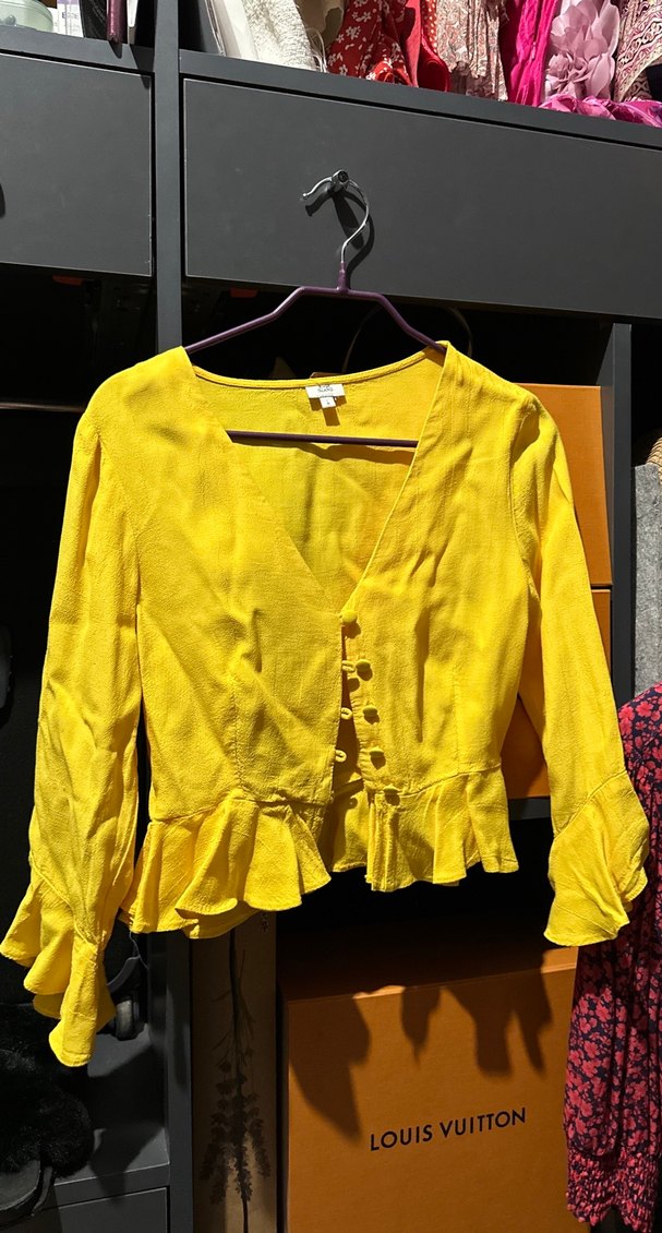 Sarı renkte, uzun kollu, V yakalı ve düğmeli kadın bluz. Salaş kesimi, ipeksi dokusu ve volanlı etek ucu ile günlük sokak tarzına uygun.