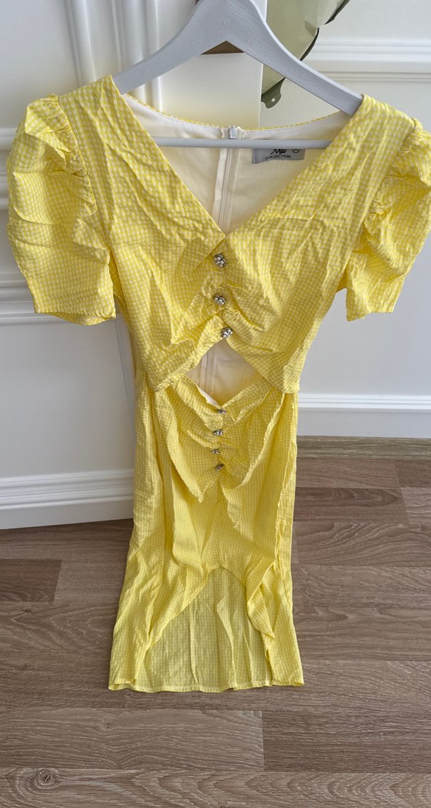 Sarı Düğmeli V Yakalı Uzun Elbise