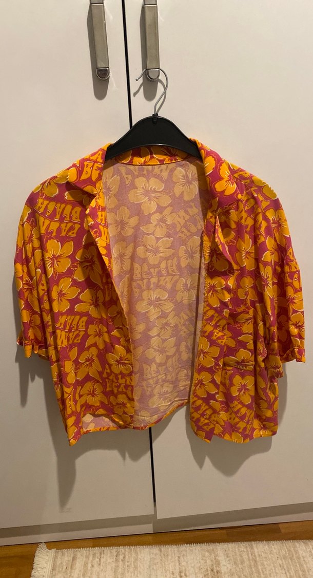 Düğmeli, kısa kollu ve yakalı bu kadın gömlek, bol kesimdir. Canlı sarı tie-dye deseniyle retro ve bohem tarzda, viskoz kumaştan yapılmıştır.