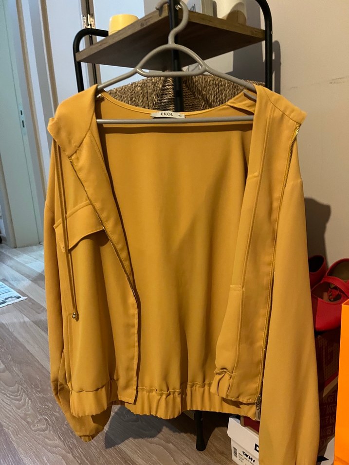 Sarı kadın ceket, bol kesim ve uzun kollu. Parlak sentetik kumaştan üretilmiş, günlük rahat kullanım için drapeli stilde.