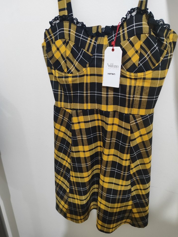 Askılı, straplez yakalı, düğmeli ve oturan model midi elbise. Koyu sarı ekose desenli, vintage tarzda tekstil kumaştan üretilmiştir. Günlük kullanıma uygundur.