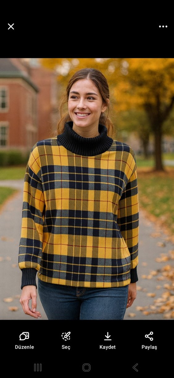 Sarı ekose desenli, boğazlı ve uzun kollu, rahat kesim kadın kazağı. Örgü yapısı ve midi uzunluğu ile dış mekan kullanımı için uygundur. buluz