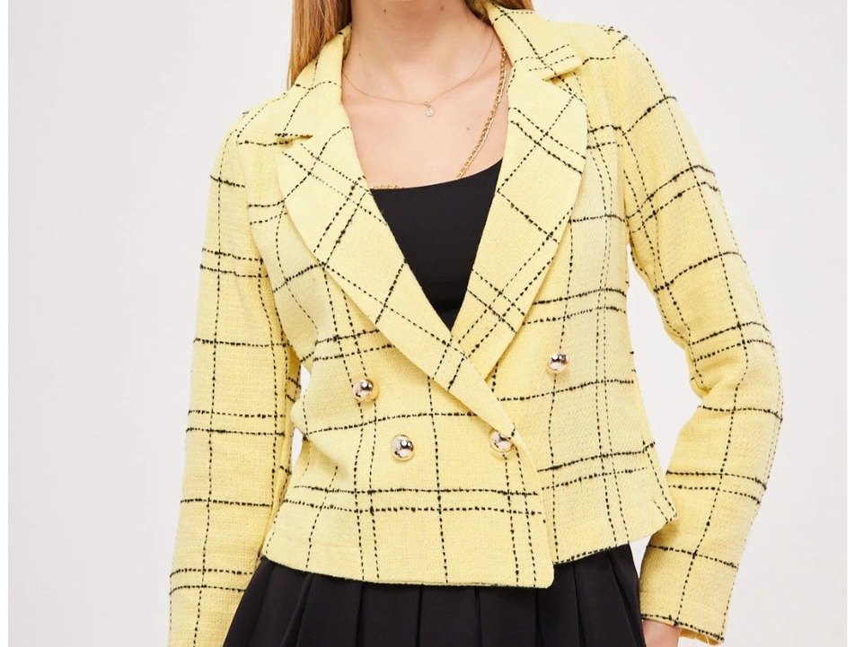 Sarı Ekose Desenli Düğmeli Kadın Blazer