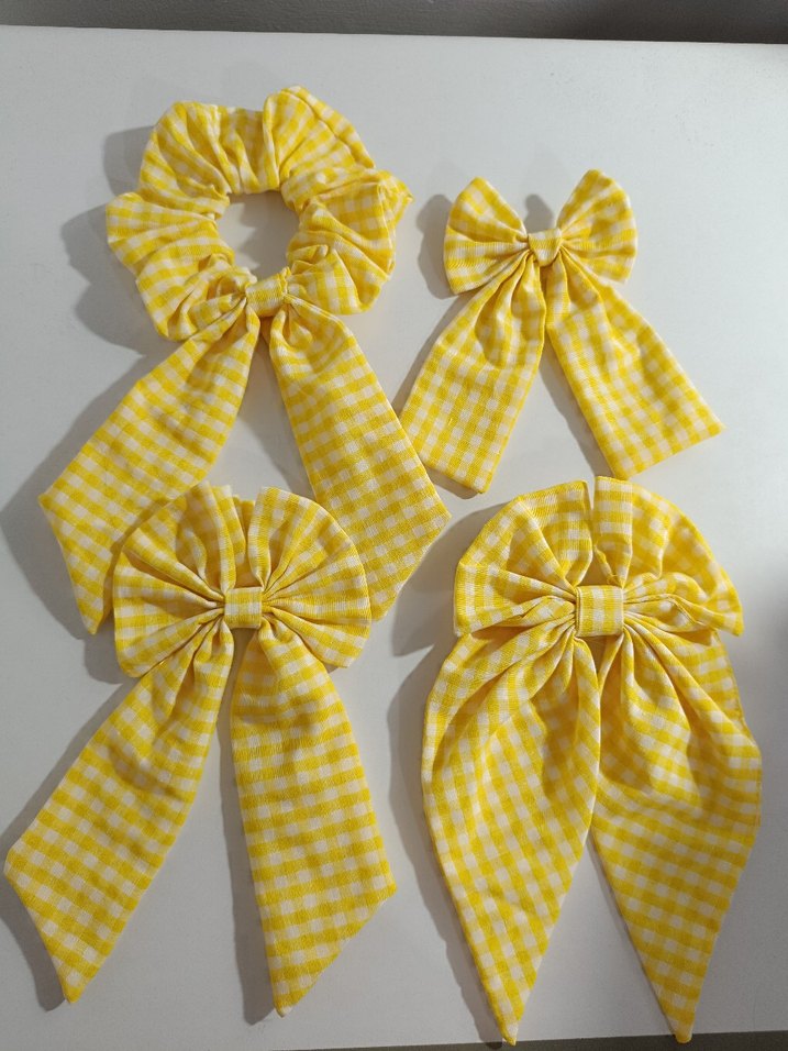 Sarı ekose desenli, petikare kumaştan yapılmış fiyonk ve uzun kurdele detaylı vintage tarzda saç aksesuarları seti.