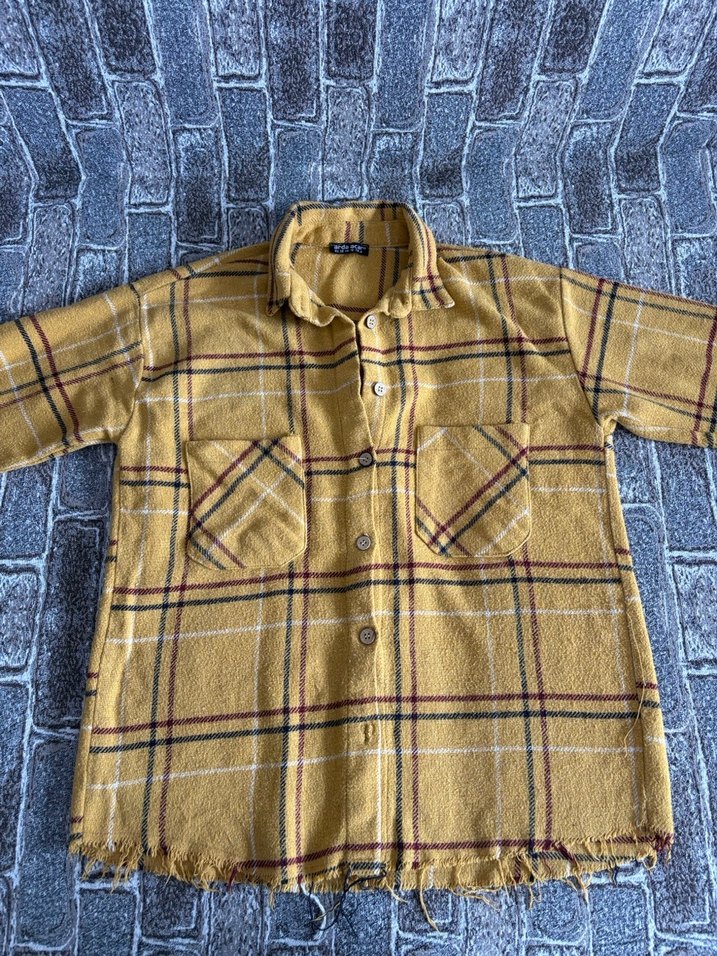 Düğmeli, uzun kollu, notched lapel yakalı, sarı ekose desenli, cep detaylı, rahat kesim kadın gömlek.
