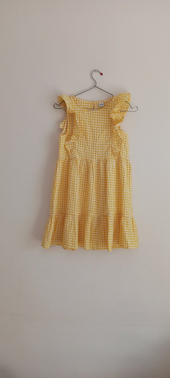 Yumuşak keten kumaştan yapılmış, sarı ekose desenli, kolsuz ve salaş kesim kız çocuk elbisesi. Fırfır detayları ve yuvarlak yaka ile bohem tarzda.