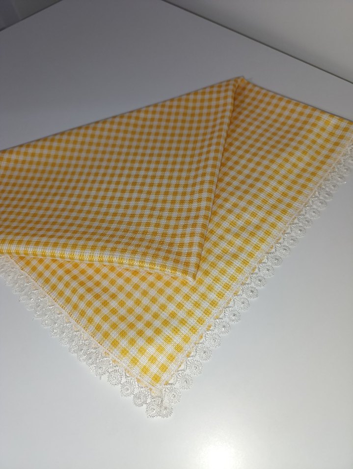 Sarı ekose desenli masa örtüsü, klasik tarzda dantel kenar detayına sahiptir. Masanızı aydınlatmak için uygundur. ️