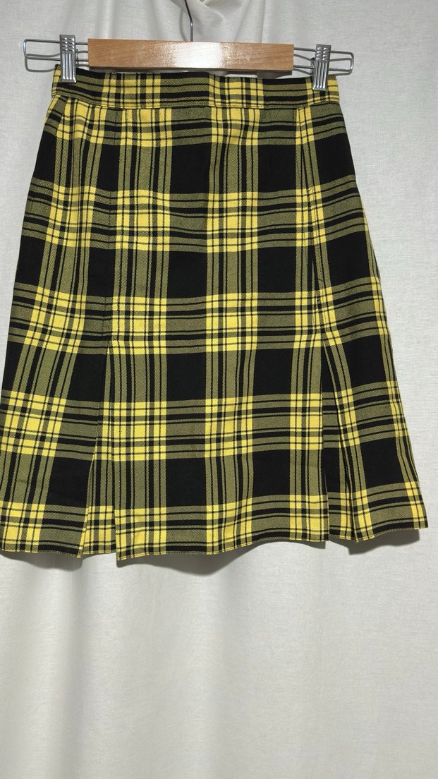 Sarı ve siyah ekose desenli, pileli ve dar kesim etek. Sokak stili için uygundur. Marka temsilidir.