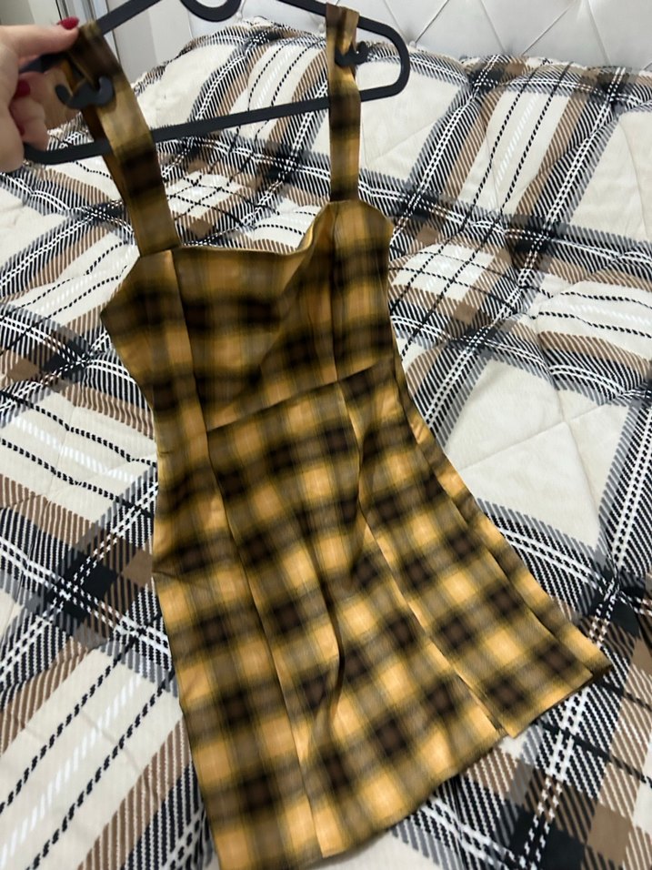 Sarı ekose desenli, transparan detaylı ve askılı kollu, vücuda oturan midi boy kokteyl elbisesi.