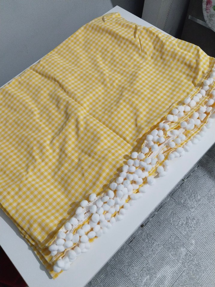 Parlak sarı ekoseli bohem tarzda masa örtüsü, kenarlarında beyaz ponpon süslemelere sahiptir.