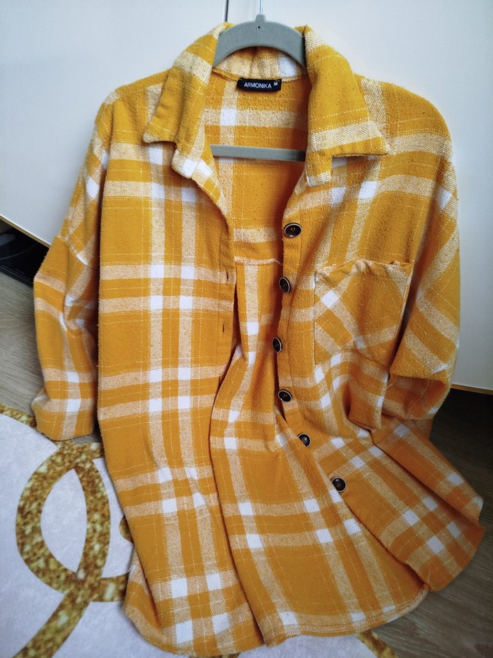 Yumuşak pamuk kumaştan yapılmış, düğmeli önü ve kesik yakası olan, bol kesim sarı ekoseli gömlek. Günlük kullanıma uygun.