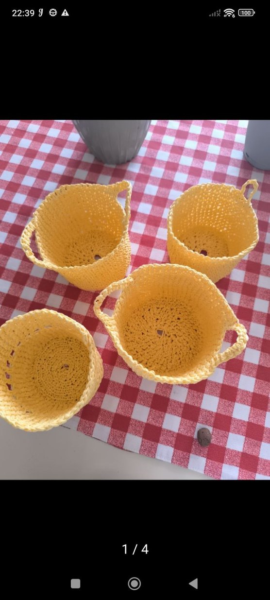 Dört adet kulplu, sarı el örgüsü bohem tarzda sepet seti. Yumuşak dokulu ve hafif, dekoratif veya küçük eşyalar için uygun.