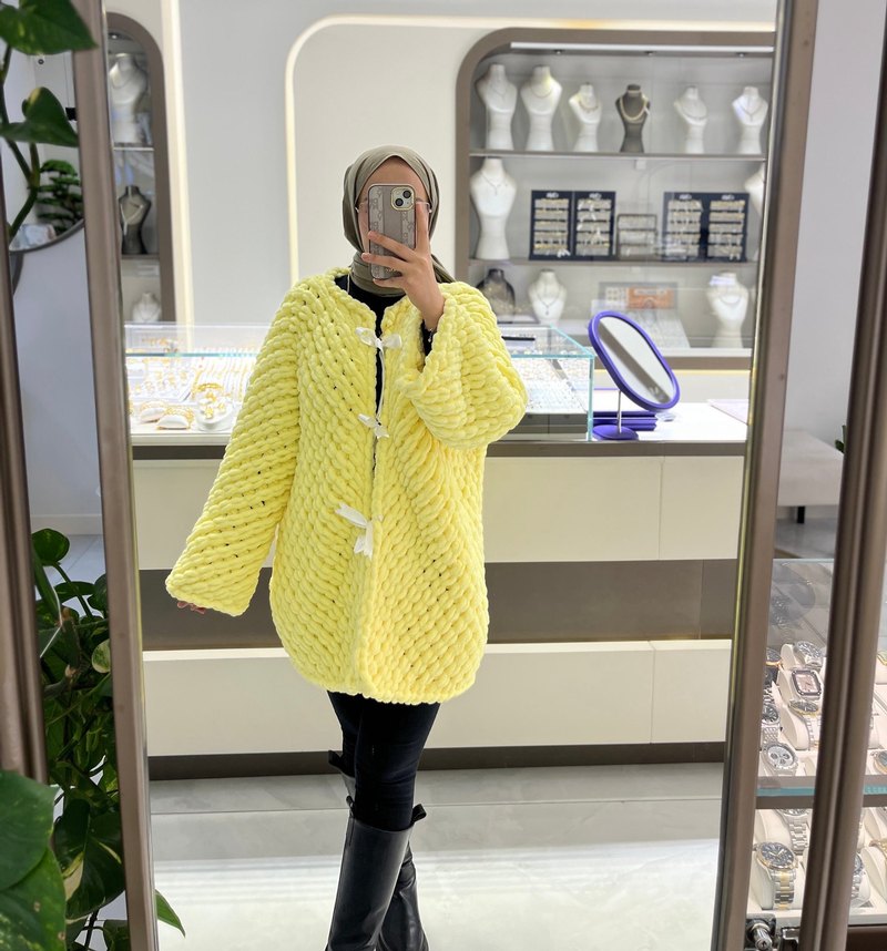 Sarı renkli, alize puffy ipten yapılmış, standart beden, görünce herkesin bayıldığı kadın hırka. İstene renkte sipariş alınır.