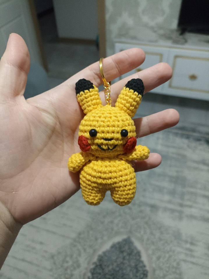 Renkli sarı el örgüsü peluş anahtarlık, siyah ve kırmızı detaylı, küçük ve yumuşak tutuşlu.