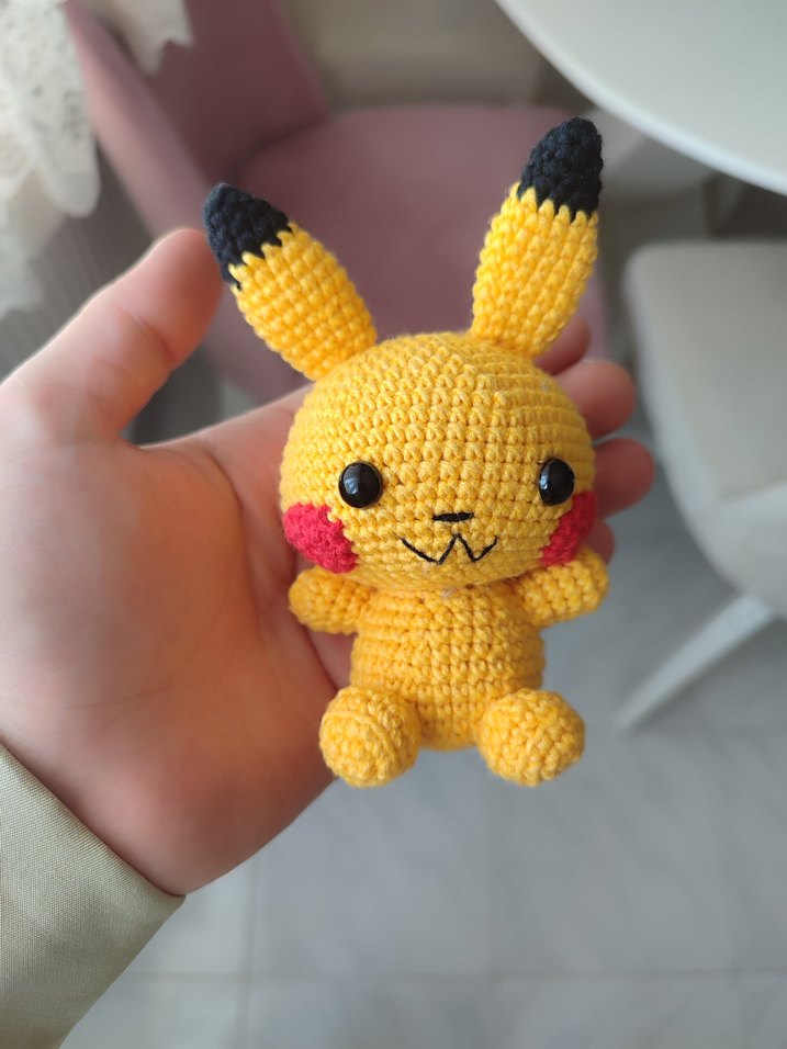 Renkli detaylara sahip, el örgüsü küçük ve yumuşak sarı peluş oyuncak.