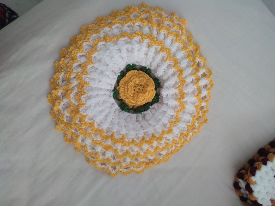 Sarı ve beyaz örgü desenli, ortasında çiçek detaylı renkli el yapımı yumuşak banyo süngeri.