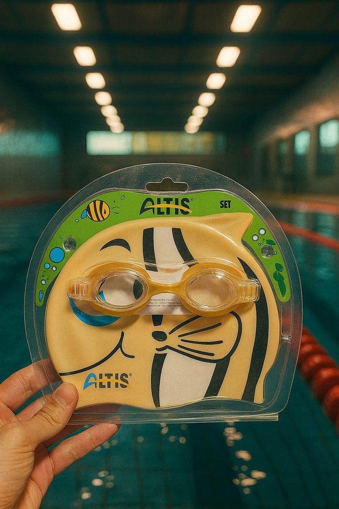 Sarı, elastik bantlı ve oturan yüzücü gözlüğü, eğlenceli desenli bone ile set halinde. Plaj ve havuz için uygundur. ♂️