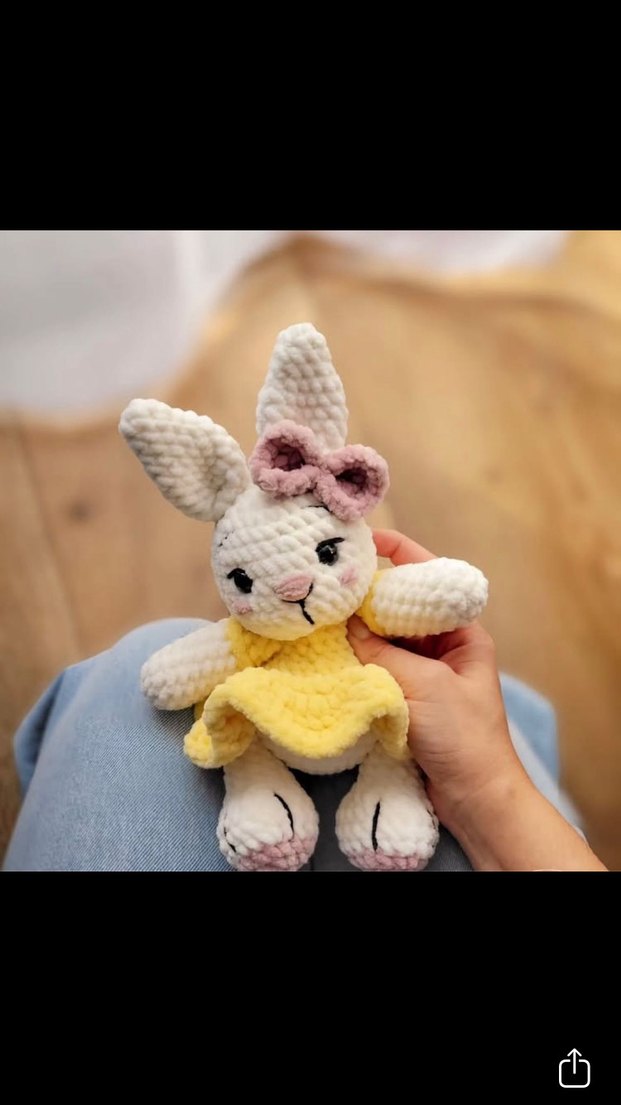 Yumuşak beyaz peluş tavşan, sarı elbise ve pembe fiyonk ile süslenmiş.