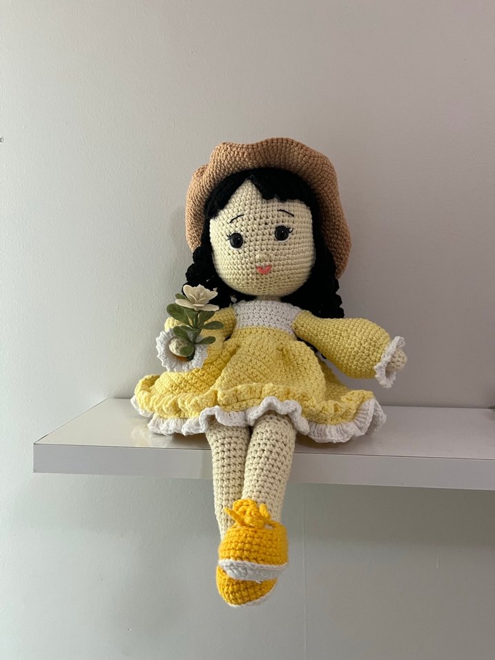 Siyah örgülü saçlı, sarı elbise ve şapkalı el yapımı büyük örgü bebek,istenilen renkte değişim yapılabilir